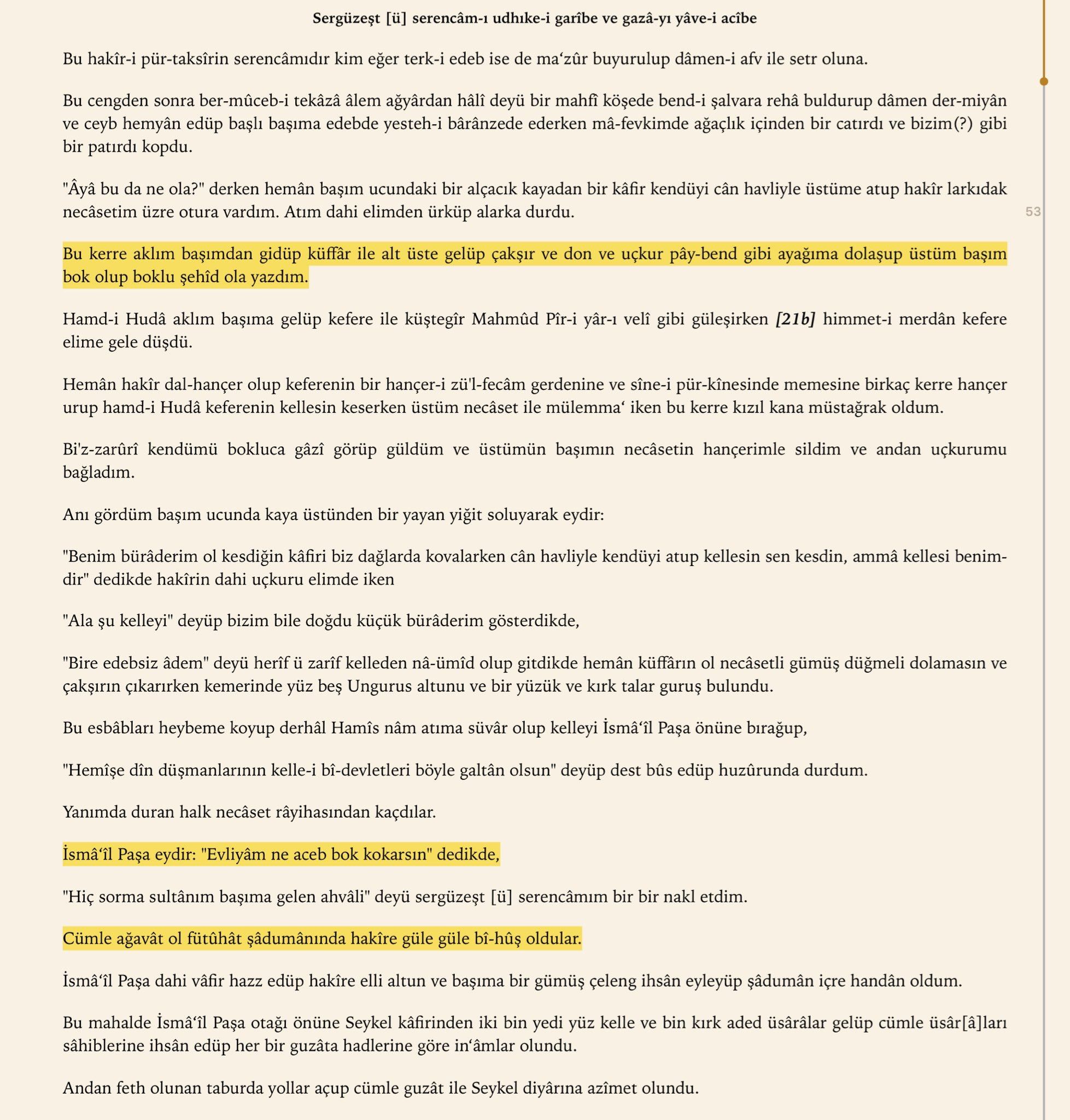 “Bu hakirin bir macerasıdır ki, her ne kadar edep dışı ise de mazur buyurulup af eteği ile örtülüversin. Bu cenkten sonra hacetimi gidermek için etrafta insan yok diye bir gizli köşede şalvarın ucuna yol buldurup etek toplayıp tek başıma edebde ihtiyacımı giderirken üst tarafımdan ağaçlık içinden bir çatırtı patırtı koptu.