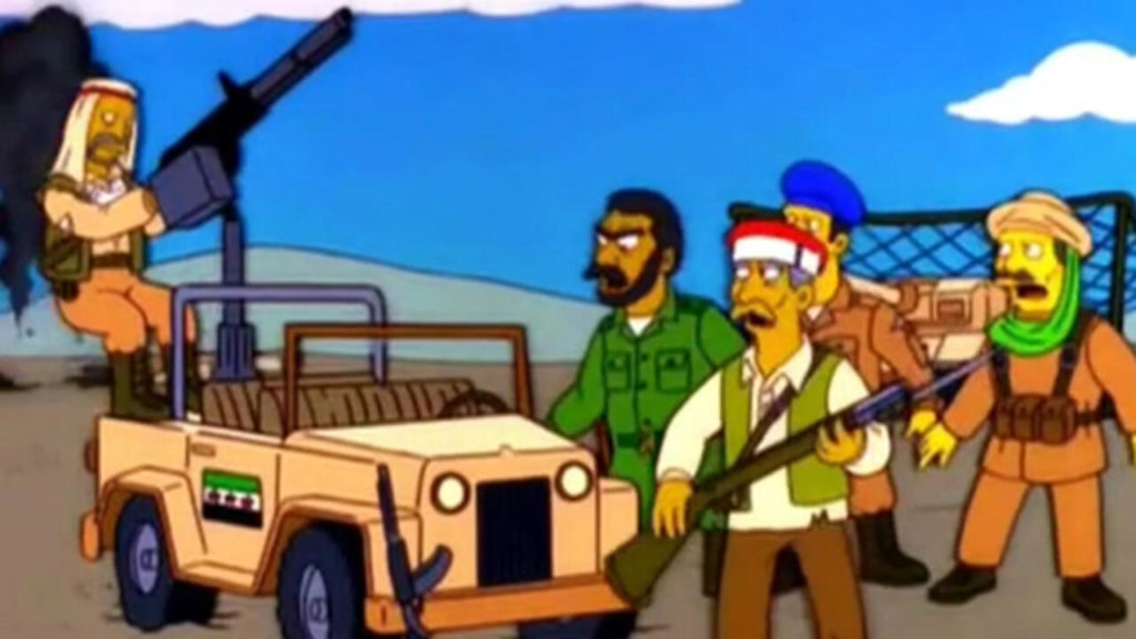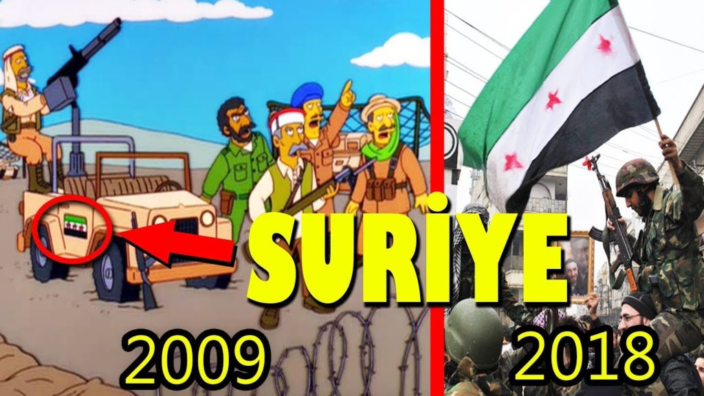 2001 yılında yayınlanan Simpsons dizisinin bu bölümünde Bir aracın arkasına katılan makineli silahı ve çevresindeki teröristleri görüyorsunuz. İşin ilginç yanı ne araba ne silah ne de teröristler. İşin en ilginç yanı aracın üzerindeki Suriye Bayrağı. Bu bölüm gösteriyor ki Suriye iç savaşının sinyalleri bazı güçler tarafından daha 2001 yılında atılmış. Kimi kaynaklara göre bu bölüm 2009 yılında yayınlanmış olup bunun bir önemi yoktur. Eğer savaştan bir gün önce bile böyle bir dizi yayınlansa işin içerisinde bir iş olduğu anlaşılmaktadır.